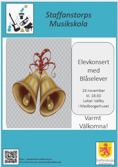 Elever och lärare i blås/träblås-instrument framför olika musikstycken. Blekingevägen 1, Staffanstorp